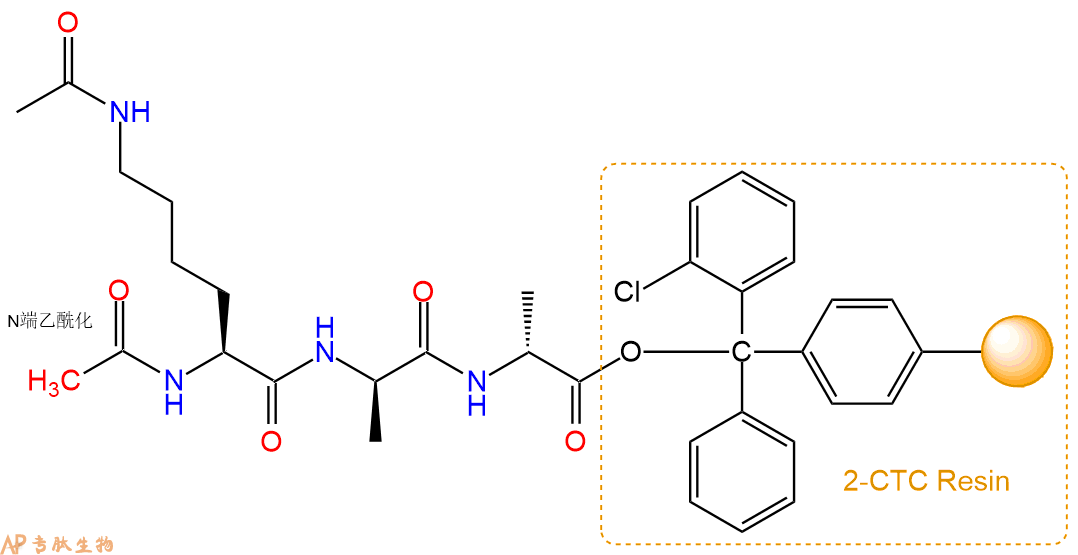 5、乙酸酐反应连接:在上述树脂中,加入适当DMF后,再加入2.23mmol乙酸酐到树脂中,再加入4.45mmol DIPEA,鼓氮气反应30分钟。用2倍树脂体积的DMF 洗涤3次树脂(洗涤树脂,去掉残留溶剂,为下一步反应做准备)。 得到Ac-Lys(Ac)-DAla-DAla-CTCResin。 结构如下: