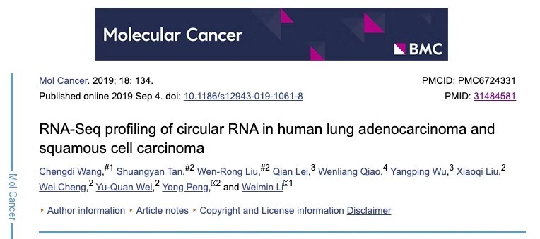 近日,我院李为民教授、彭勇教授团队在肿瘤学领域著名期刊Molecular Cancer(IF=10.68)发表了非小细胞肺癌中环状RNA(circular RNA, circRNA)的最新研究成果,证明了circRNA可作为肺癌诊断的新型标志物。
