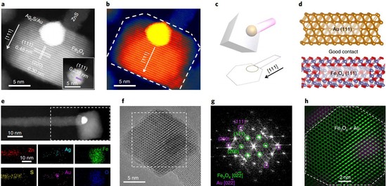图2:四元异质纳米棒的外延生长表征。(a-b)高分辨图像显示每种组分晶面,展示了沿立方晶体[111]轴的外延生长方向。(c)异质纳米棒的三维模型和俯视投影图。(d)晶面原子模型。(e)纳米棒组分元素分布。(f-h)纳米棒端点结构分析。