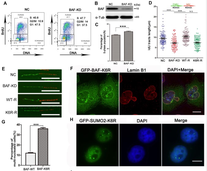 该研究团队还发现,BAF的SUMO化修饰程度在S期最高。在HEK293细胞中敲低BAF,会引起S期阻滞以及DNA复制速率减慢。进一步研究发现,BAF在S期与调控S期进程的重要蛋白PCNA共定位并存在相互作用;通过免疫共沉淀、凝胶阻滞以及等温滴定等实验,发现BAF的SUMO化修饰能够稳定BAF与DNA和BAF与PCNA的结合,从而维持S期的正常进程。