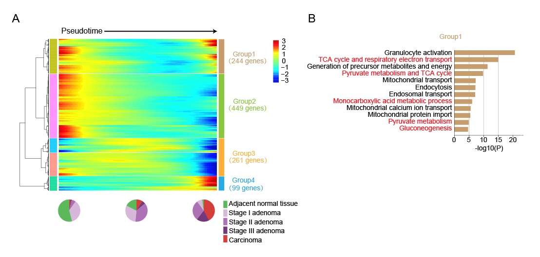 4. 探究了腺瘤发生以及腺瘤向腺癌转变过程中转录组的动态变化。该研究利用来自FAP患者癌旁组织、低级别腺瘤、高级别腺瘤、以及腺癌的上皮细胞之间的系统比较揭示了腺瘤发生和恶化的基因表达变化的关键特征。发现那些随肿瘤发展呈现动态变化的基因按照其变化趋势可分为4类。其中第一类基因随着腺瘤发生迅速下调表达而在腺瘤向腺癌转变的后期又被部分上调表达。GO分析结果显示这类基因强富集三羧酸循环和丙酮酸代谢途径基因。早在1924年糖代谢途径的重编程就被发现是癌细胞区别于正常上皮细胞的重要特征之一(Weinberg, 2014)。而该研究结果指出,三羧酸循环相关的代谢基因在良性腺瘤发生的早期就开始强烈下调表达,这些基因反而在从良性腺瘤到恶性腺癌的转变过程中有所回升,但是仍然低于癌旁组织中正常上皮细胞中的水平。这说明三羧酸循环代谢水平的降低是肿瘤发生过程中的最早期事件之一,可能是治疗FAP患者的较好的治疗靶点通路。