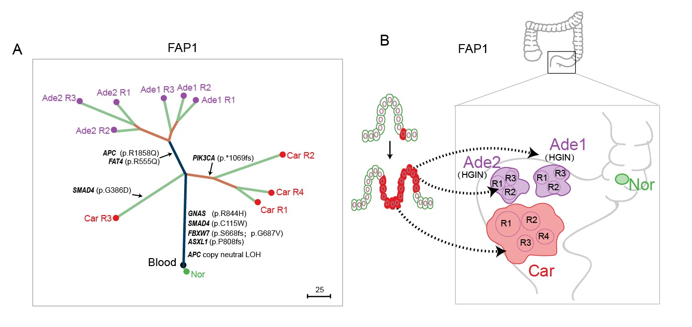 2. FAP患者中存在区域癌变现象。该研究通过体细胞突变情况对来自于同一个患者的不同病变组织构建了谱系发生树。在其中2例患者中(FAP1和FAP2),发现物理位置较近的多个原位腺瘤和腺癌起源于同一个病变始祖细胞,这证明了在FAP患者中存在之前在散发结直肠癌研究报道的区域癌变现象(图3)(Baba et al., 2016; Curtius et al., 2017; Slaughter et al., 1953),也就是病变始祖细胞分裂增殖的后代细胞迁移到肠上皮组织的不同部位并进一步进展到腺瘤和腺癌阶段,产生物理上分隔开(但是有共同谱系来源的)的不同肿瘤块。阐明FAP患者中存在区域癌变现象对于进一步理解结直肠多发腺瘤的发生机制和临床治疗具有重要的指导意义。