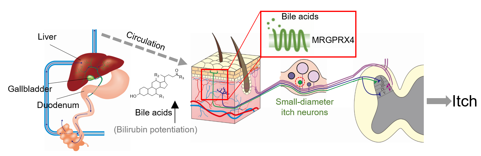 为了探索人胆汁淤积瘙痒的分子机理,并为开发治疗慢性瘙痒的药物提供理论依据,李毓龙研究组筛选了在人体背根神经节(human dorsal root ganglia, hDRG)中富集表达的G蛋白偶联受体(GPCR),鉴定出了一个灵长类动物特有的胆汁酸受体MRGPRX4,并发现胆汁酸通过MRGPRX4介导胆汁淤积性瘙痒。此项研究发现MRGPRX4能够被一系列胆汁酸分子激活并引起兴奋性下游细胞信号,并且胆汁酸能在培养的表达MRGPRX4的DRG神经元中引起动作电位。原位杂交和免疫组化的结果表明,MRGPRX4表达于约 7% 的 hDRG神经元中,该群神经元同时表达已知的痒觉受体——组胺受体H1(histamine receptor H1, HRH1)。功能上,胆汁酸能够激活体外培养的一部分hDRG神经元,且与表达情况类似,该群神经元部分能被组胺激活。行为学上,皮下注射胆汁酸或MRGPRX4的非胆汁酸激动剂均可在健康受试者中引起明显的痒觉。临床上,肝病瘙痒患者血浆胆汁酸水平显著高于肝病非瘙痒患者,前者在瘙痒缓解后血浆胆汁酸水平显著降低;此外,肝病瘙痒患者血浆中胆汁酸浓度足以激活MRGPRX4,而健康人血浆中胆汁浓度不能激活MRGPRX4。这些证据表明胆汁酸和MRGPRX4分别是引起肝病胆汁淤积瘙痒的致痒剂和受体。