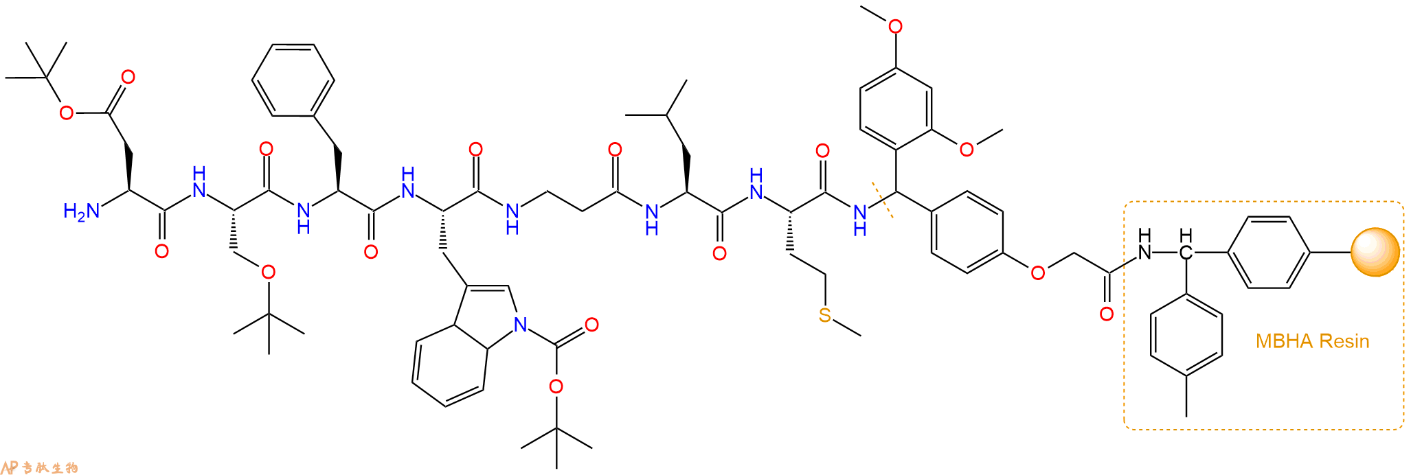 最后再经过步骤二得到 H2N-Asp(OtBu)-Ser(tBu)-Phe-Trp(Boc)-βAla-Leu-Met-Linker-MBHA Resin,结构如下: