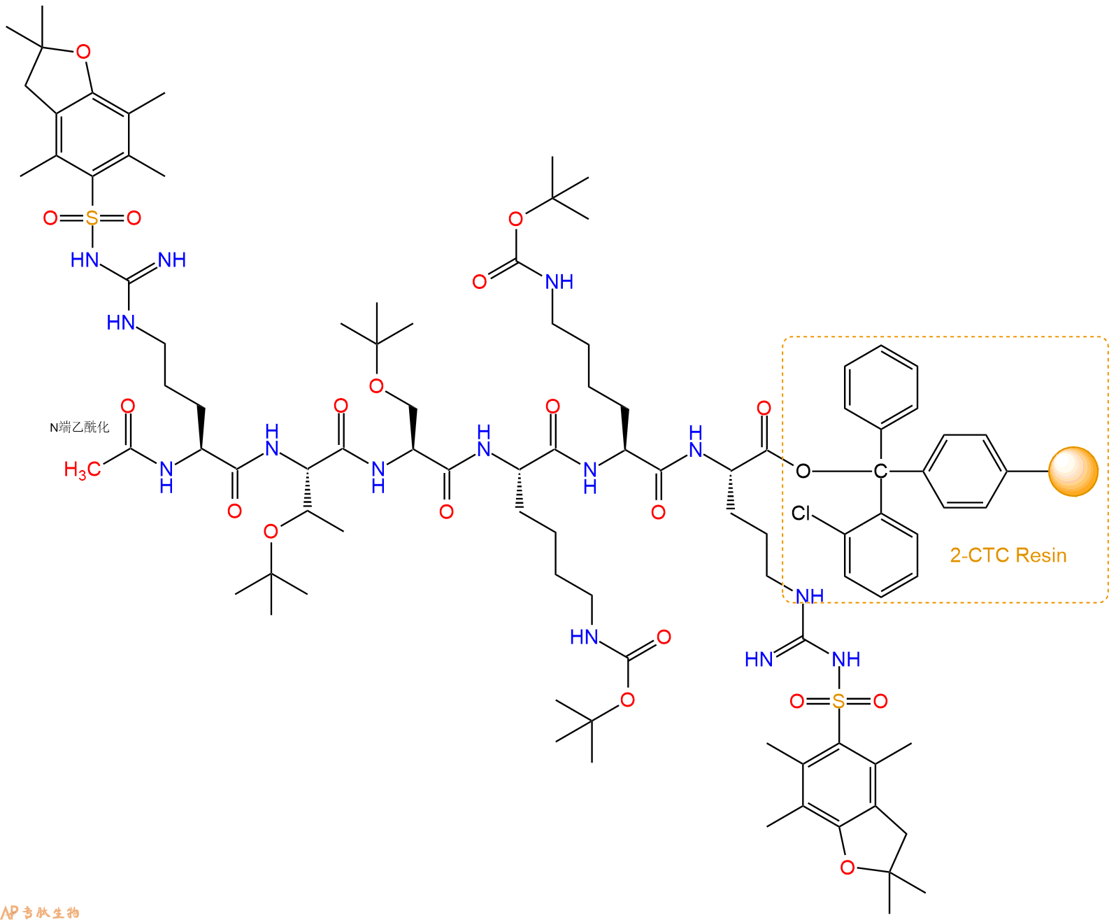 5、乙酸酐反应连接:在上述树脂中,加入适当DMF后,再加入2.86mmol 乙酸酐到树脂中,再加入5.73mmol DIPEA、2.72mmol HBTU,鼓氮气反应30分钟。用2倍树脂体积的DMF 洗涤3次树脂(洗涤树脂,去掉残留溶剂,为下一步反应做准备)。 得到Ac-Arg(Pbf)-Thr(tBu)-Ser(tBu)-Lys(Boc)-Lys(Boc)-Arg(Pbf)-CTC Resin。 结构如下: