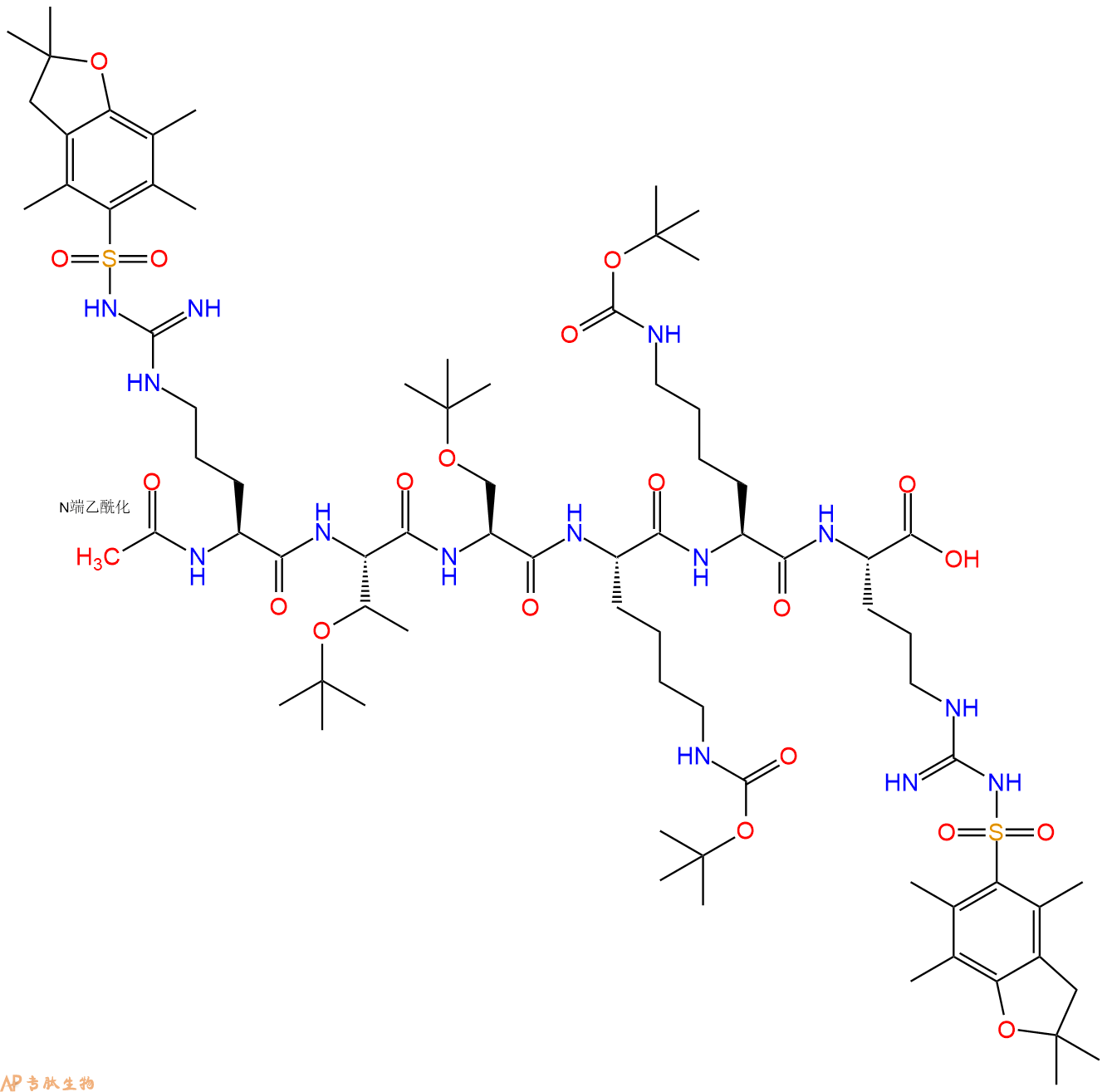 6、全保护切割:配置0.5%TFA/DCM溶液,溶液体积约为树脂体积的3倍。再次用DCM洗涤树脂2遍(去除残留DMF),后将配置好的溶液倒入到反应器中,反应30分钟。抽滤树脂,收集滤液(此时多肽已经从树脂上分离,存在于滤液中)。多肽序列为 Ac-Arg(Pbf)-Thr(tBu)-Ser(tBu)-Lys(Boc)-Lys(Boc)-Arg(Pbf)-CTC Resin。 在滤液中添加DIEPA,调PH至7-8。用饱和NaHCO3洗涤滤液,分离出DCM层溶液。可适当旋蒸DCM层溶液,减少有机溶剂。再次加入1或2倍体积的乙酸乙酯,用稀HCl溶液调PH至微酸性,将多肽从DCM层萃取到乙酸乙酯层。用饱和NaCl洗涤2次乙酸乙酯层。用无水硫酸镁吸收乙酸乙酯层的水分。通过减压旋蒸,直接将乙酸乙酯完全旋蒸掉,得到晶体状固体多肽,用于下一步C端反应。或通过减压旋蒸保留适量乙酸乙酯的溶液体积,加入冰乙醚析出 多肽,然后对多肽进行烘干操作即可用于下一步C端反应。Ac-Arg(Pbf)-Thr(tBu)-Ser(tBu)-Lys(Boc)-Lys(Boc)-Arg(Pbf)-COOH的结构图如下。