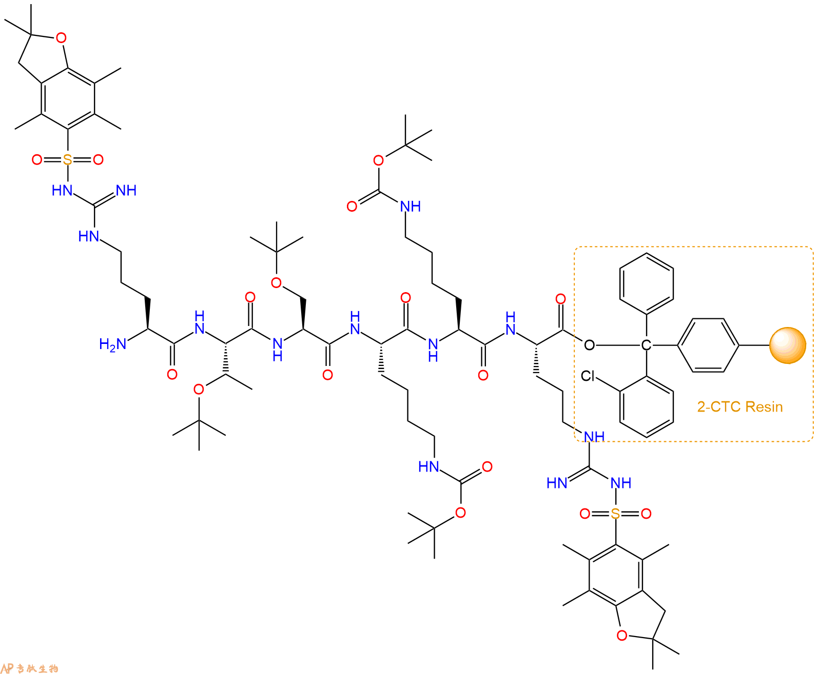 最后再经过步骤二得到 H2N-Arg(Pbf)-Thr(tBu)-Ser(tBu)-Lys(Boc)-Lys(Boc)-Arg(Pbf)-CTC Resin,结构如下: