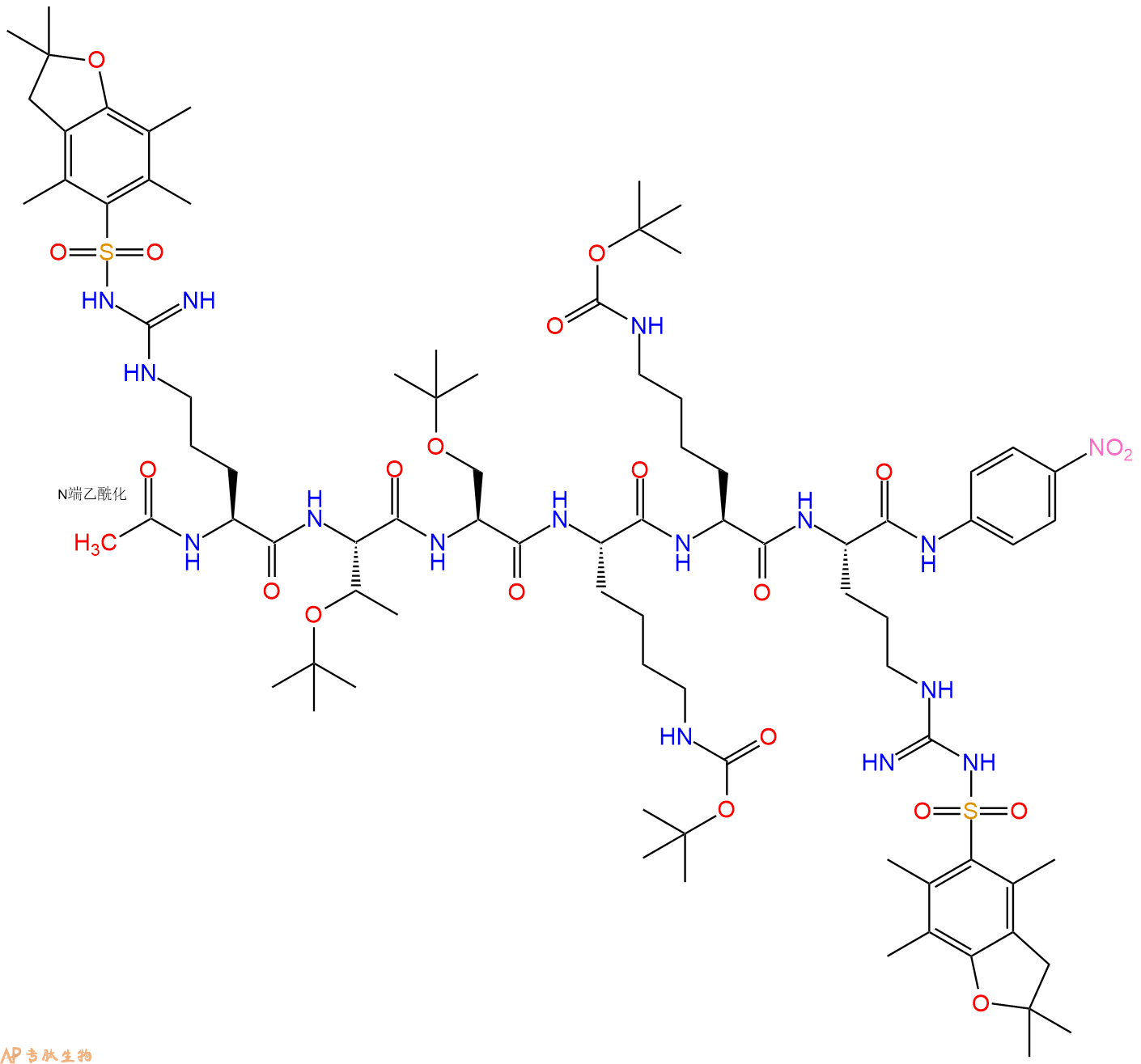 7、4-硝基苯胺反应连接:在上述树脂中,加入适当DMF后,再加入2.86mmol 4-硝基苯胺到树脂中,再加入5.73mmol DIPEA、2.72mmol HBTU,鼓氮气反应30分钟。用2倍树脂体积的DMF 洗涤3次树脂(洗涤树脂,去掉残留溶剂,为下一步反应做准备)。 得到 Ac-Arg(Pbf)-Thr(tBu)-Ser(tBu)-Lys(Boc)-Lys(Boc)-Arg(Pbf)-pNA。 结构如下: