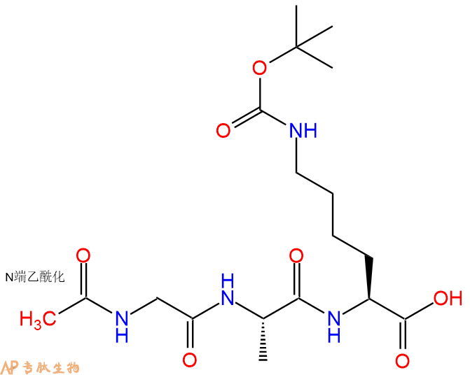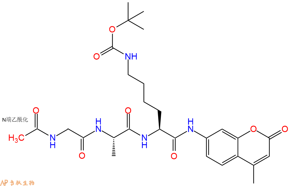 | 三字母: | Ac N端乙酰化封端,一种常见的修饰方式,常用于模拟蛋白质中的肽片段。 -Gly甘氨酸:glycine。系统命名为 2-氨基乙酸。是编码氨基酸中没有旋光性的最简单的氨基酸,因具有甜味而得名。符号:G,Gly。 -Ala丙氨酸:alanine。L-丙氨酸的系统命名为(2S)-氨基丙酸,是编码氨基酸,也叫L-α-丙氨酸。符号:A,Ala。D-丙氨酸存在于多种细菌细胞壁的糖肽中。β-丙氨酸是维生素泛酸和辅酶A的组分。 -LysL-赖氨酸:lysine。系统命名为(2S)-6-二氨基已酸。是编码氨基酸中的碱性氨基酸,哺乳动物的必需氨基酸。在蛋白质中的赖氨酸可以被修饰为多种形式的衍生物。符号:K,Lys。 -AMC7-氨基-4-甲基香豆素(AMC或Amc)是一种荧光染料,其激发波长为350纳米,发射波长为450纳米。 |