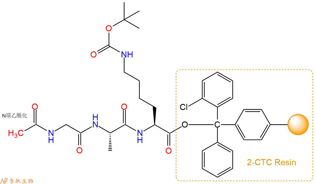 5、乙酸酐反应连接:在上述树脂中,加入适当DMF后,再加入2.42mmol 乙酸酐到树脂中,再加入4.84mmol DIPEA、2.3mmol HBTU,鼓氮气反应30分钟。用2倍树脂体积的DMF 洗涤3次树脂(洗涤树脂,去掉残留溶剂,为下一步反应做准备)。 得到Ac-Gly-Ala-Lys(Boc)-CTC Resin。 结构如下: