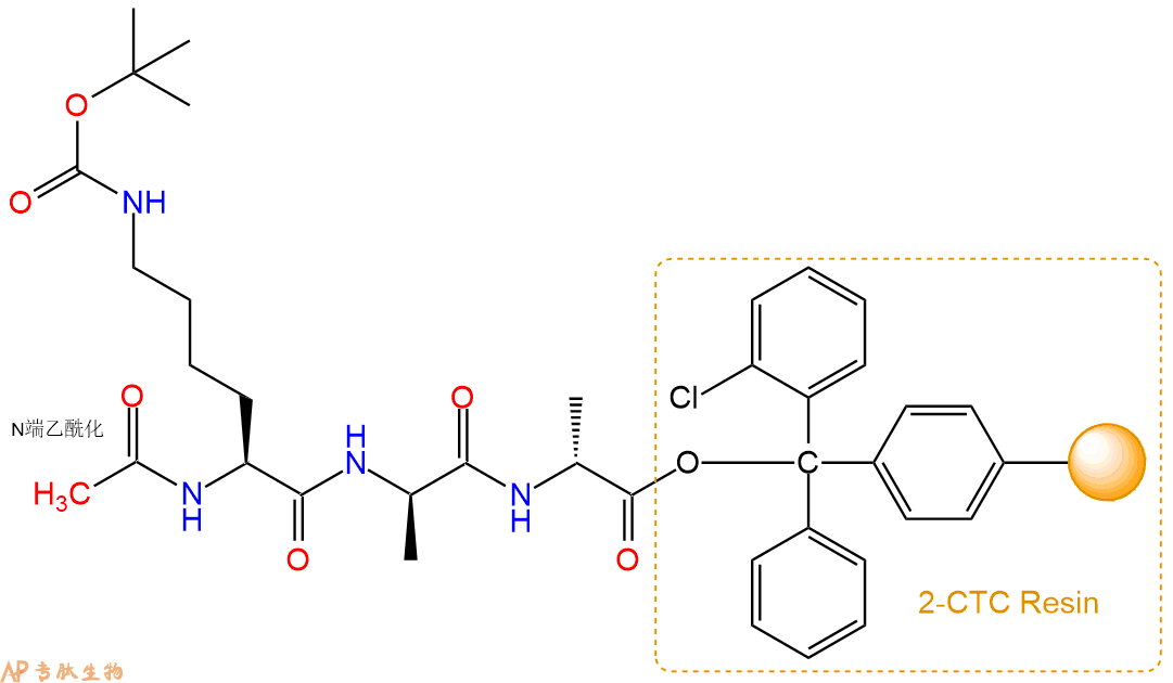 5、乙酸酐反应连接:在上述树脂中,加入适当DMF后,再加入1.79mmol乙酸酐到树脂中,再加入3.59mmol DIPEA,鼓氮气反应30分钟。用2倍树脂体积的DMF 洗涤3次树脂(洗涤树脂,去掉残留溶剂,为下一步反应做准备)。 得到Ac-Lys(Boc)-DAla-DAla-CTCResin。 结构如下: