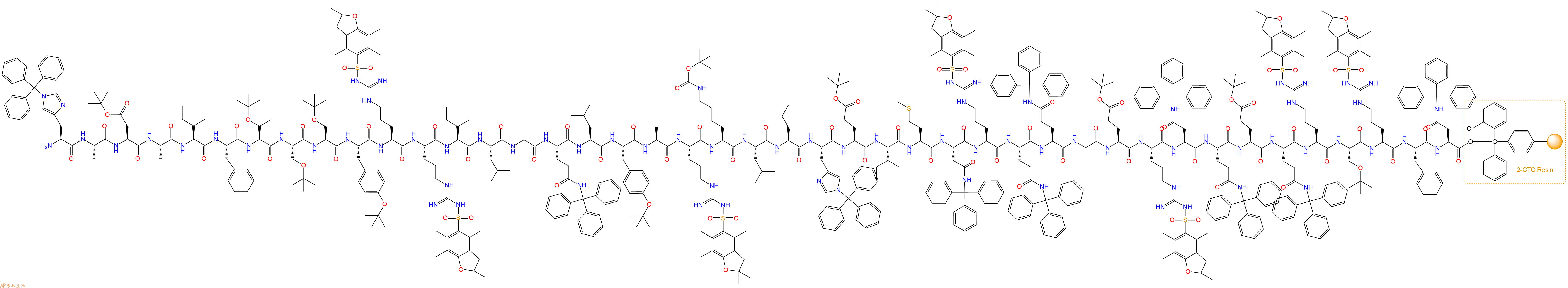 H2N-Arg(Pbf)-Arg(Pbf)-Ile-Leu-Gly-Gln(Trt)-Leu-Tyr(tBu)-Ala-Arg(Pbf)-Lys(Boc)-Leu-Leu-His(Trt)-Glu(OtBu)-Ile-Met-Asn(Trt)-Arg(Pbf)-Gln(Trt)-Gln(Trt)-Gly-Glu(OtBu)-Arg(Pbf)-Asn(Trt)-Gln(Trt)-Glu(OtBu)-Gln(Trt)-Arg(Pbf)-Ser(tBu)-Arg(Pbf)-Phe-Asn(Trt)-CTC Resin
