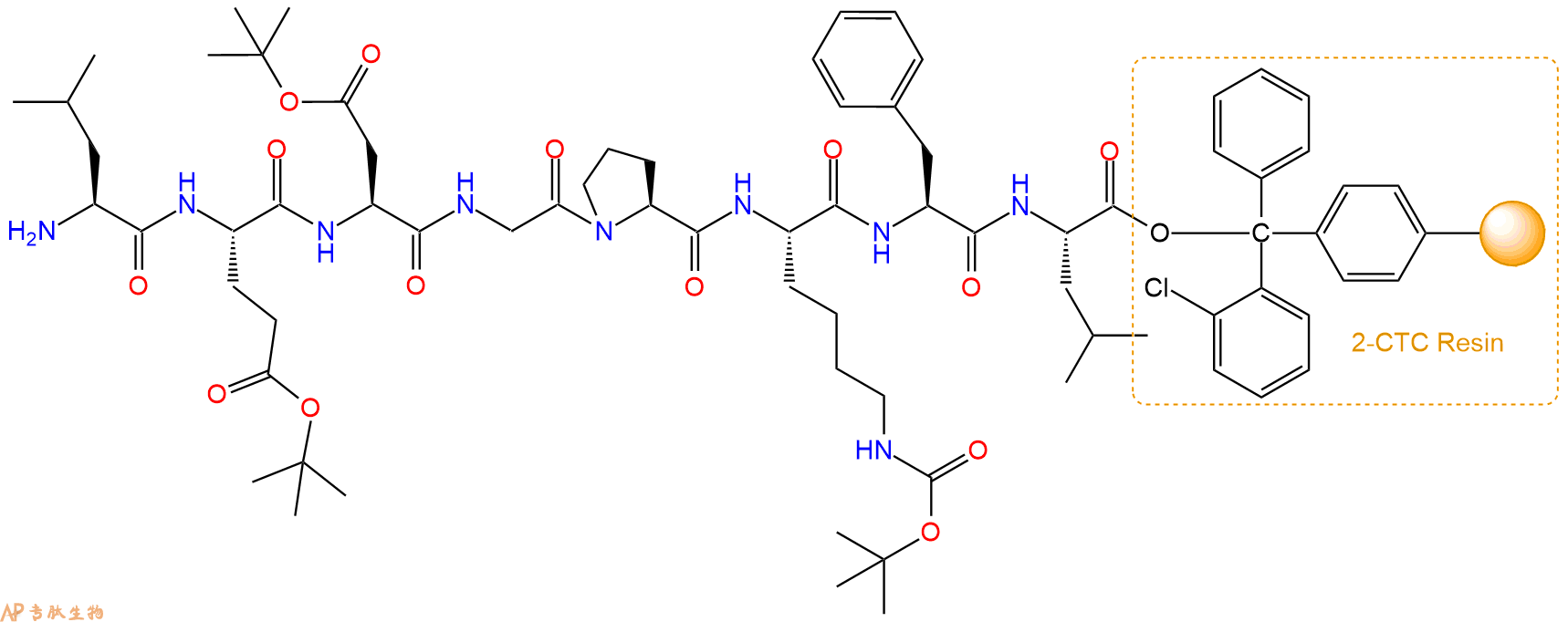 最后再经过步骤二得到 H2N-Leu-Glu(OtBu)-Asp(OtBu)-Gly-Pro-Lys(Boc)-Phe-Leu-CTC Resin,结构如下: