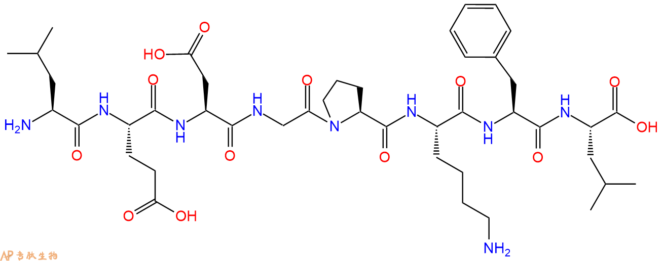 5、切割:6倍树脂体积的切割液(或每1g树脂加8ml左右的切割液),摇床摇晃 2小时,过滤掉树脂,用冰无水乙醚沉淀滤液,并用冰无水乙醚洗涤沉淀物3次,最后将沉淀物放真空干燥釜中,常温干燥24小试,得到粗品H2N-Leu-Glu-Asp-Gly-Pro-Lys-Phe-Leu-COOH。结构图见产品结构图。
