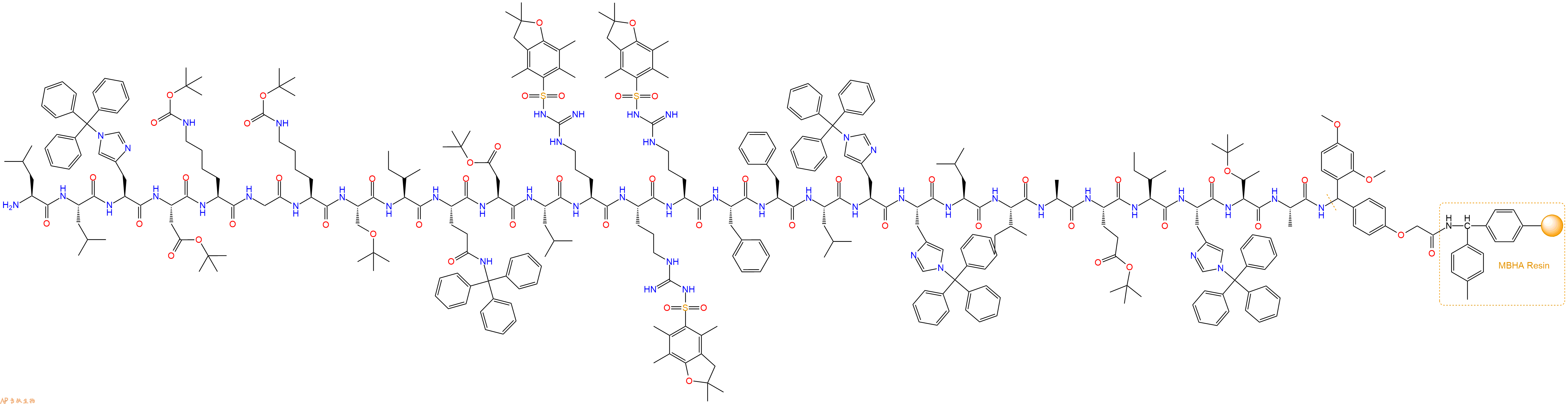 Fmoc-Leu-Arg(Pbf)-Arg(Pbf)-Arg(Pbf)-Phe-Phe-Leu-His(Trt)-His(Trt)-Leu-Ile-Ala-Glu(OtBu)-Ile-His(Trt)-Thr(tBu)-Ala-Linker-MBHA Resin
