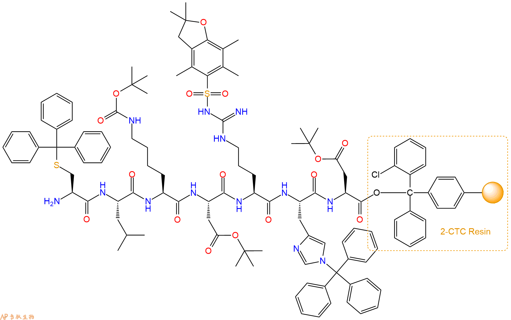 最后再经过步骤二得到 H2N-Cys(Trt)-Leu-Lys(Boc)-Asp(OtBu)-Arg(Pbf)-His(Trt)-Asp(OtBu)-CTC Resin,结构如下: