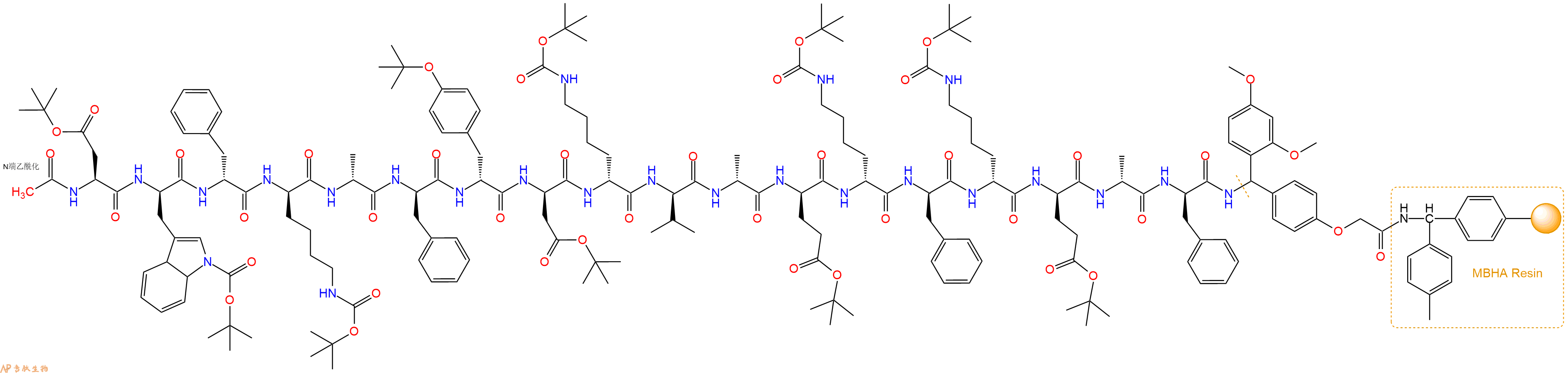 5、乙酸酐反应连接:在上述树脂中,加入适当DMF后,再加入2.47mmol乙酸酐到树脂中,再加入4.95mmol DIPEA,鼓氮气反应30分钟。用2倍树脂体积的DMF 洗涤3次树脂(洗涤树脂,去掉残留溶剂,为下一步反应做准备)。 得到Ac-Asp(OtBu)-DTrp(Boc)-DPhe-DLys(Boc)-DAla-DPhe-DTyr(tBu)-DAsp(OtBu)-DLys(Boc)-DVal-DAla-DGlu(OtBu)-DLys(Boc)-DPhe-DLys(Boc)-DGlu(OtBu)-DAla-DPhe-Linker-MBHAResin。 结构如下: