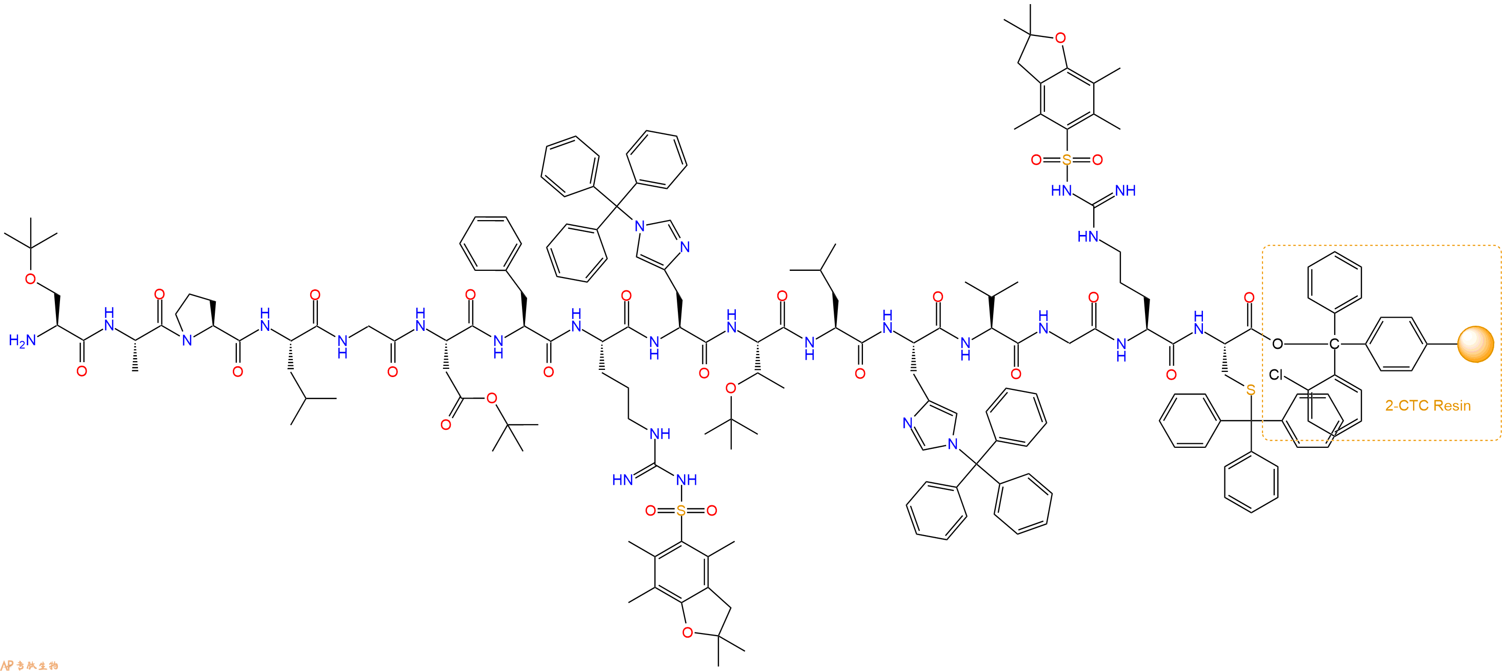 最后再经过步骤二得到 H2N-Ser(tBu)-Ala-Pro-Leu-Gly-Asp(OtBu)-Phe-Arg(Pbf)-His(Trt)-Thr(tBu)-Leu-His(Trt)-Val-Gly-Arg(Pbf)-Cys(Trt)-CTC Resin,结构如下: