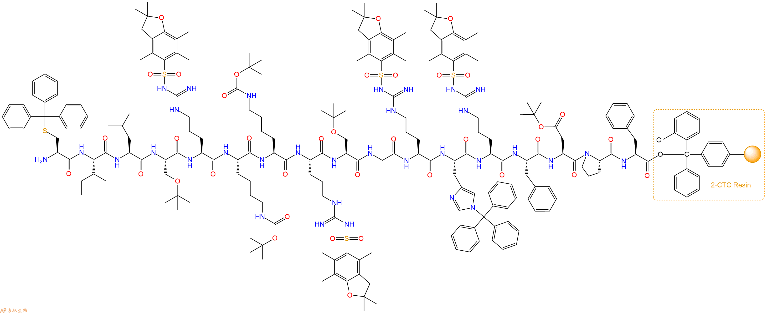 最后再经过步骤二得到 H2N-Cys(Trt)-Ile-Leu-Ser(tBu)-Arg(Pbf)-Lys(Boc)-Lys(Boc)-Arg(Pbf)-Ser(tBu)-Gly-Arg(Pbf)-His(Trt)-Arg(Pbf)-Phe-Asp(OtBu)-Pro-Phe-CTC Resin,结构如下: