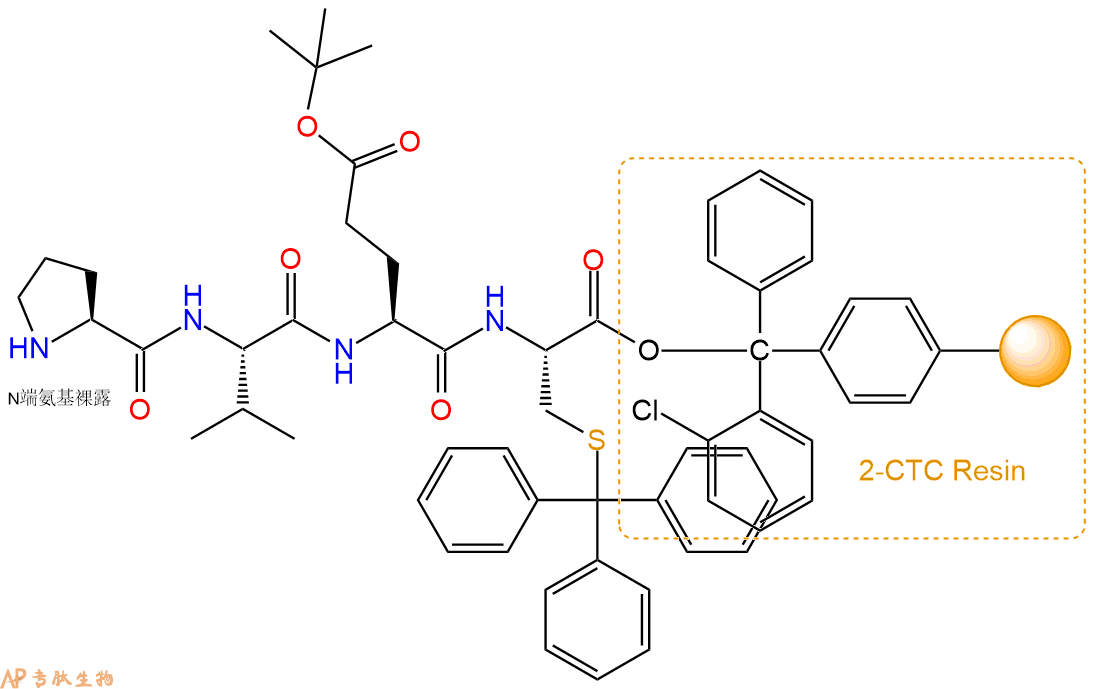 最后再经过步骤二得到 H2N-Pro-Val-Glu(OtBu)-Cys(Trt)-CTC Resin,结构如下: