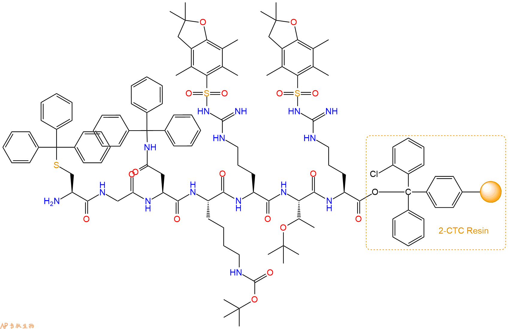 最后再经过步骤二得到 H2N-Cys(Trt)-Gly-Asn(Trt)-Lys(Boc)-Arg(Pbf)-Thr(tBu)-Arg(Pbf)-CTC Resin,结构如下: