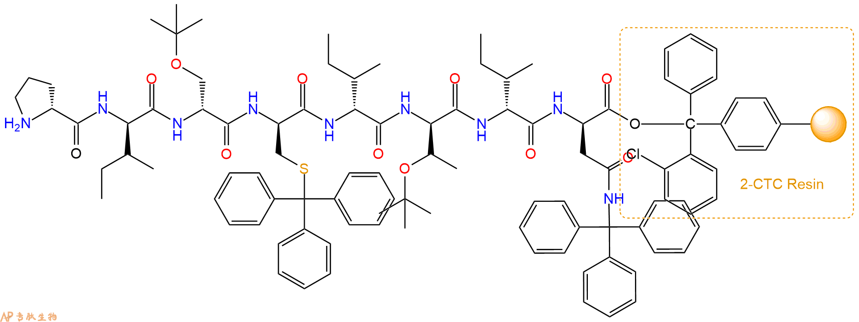 最后再经过步骤二得到 H2N-DPro-DIle-DSer(tBu)-DCys(Trt)-DIle-DThr(tBu)-DIle-DAsn(Trt)-CTC Resin,结构如下: