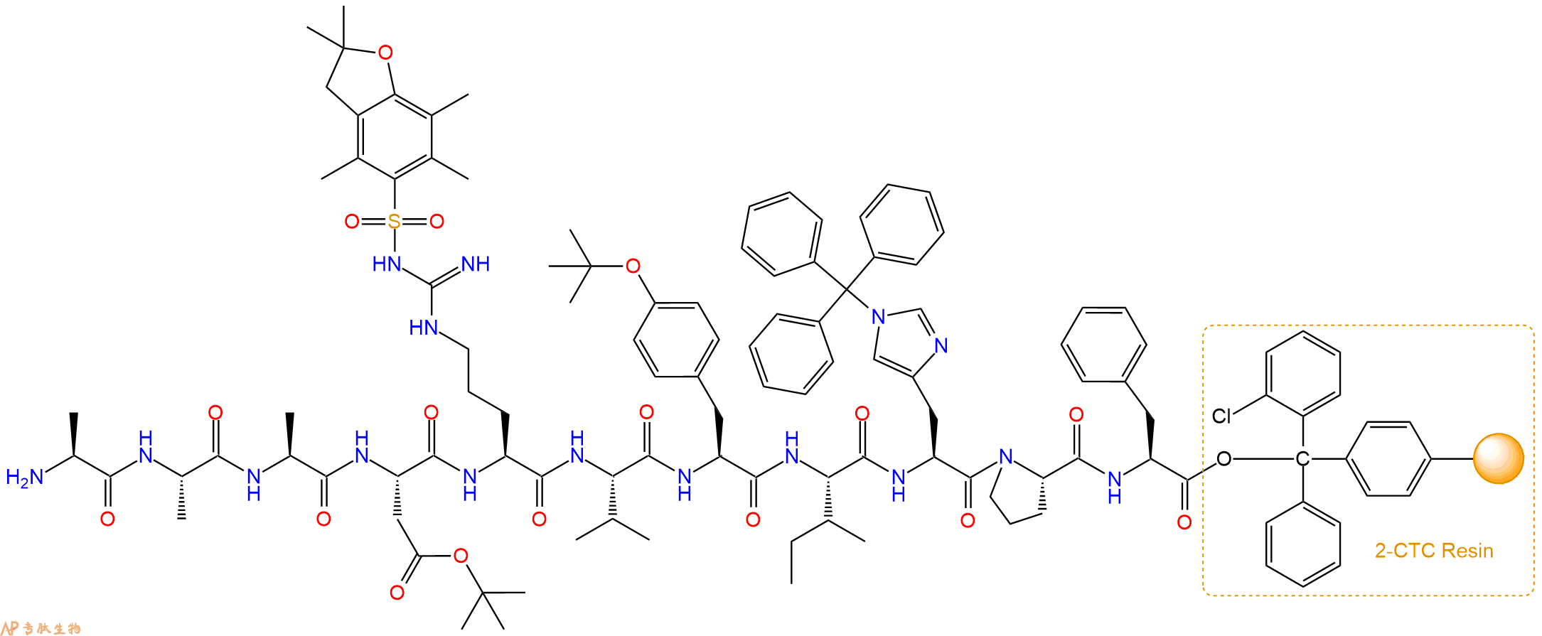 最后再经过步骤二得到 H2N-Ala-Ala-Ala-Asp(OtBu)-Arg(Pbf)-Val-Tyr(tBu)-Ile-His(Trt)-Pro-Phe-CTC Resin,结构如下: