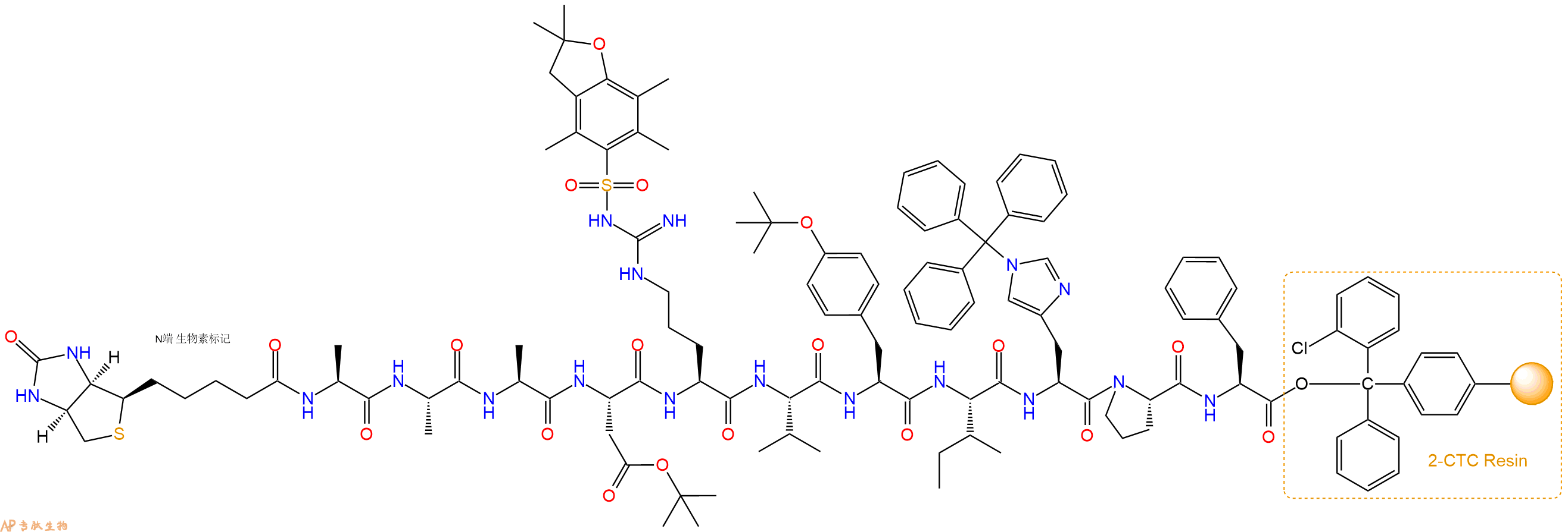 5、生物素反应连接:在上述树脂中,加入适当DMF后,再加入2.39mmol 生物素到树脂中,再加入4.78mmol DIPEA、2.27mmol HBTU,鼓氮气反应30分钟。用2倍树脂体积的DMF 洗涤3次树脂(洗涤树脂,去掉残留溶剂,为下一步反应做准备)。 得到Biotin-Ala-Ala-Ala-Asp(OtBu)-Arg(Pbf)-Val-Tyr(tBu)-Ile-His(Trt)-Pro-Phe-CTCResin。 结构如下: