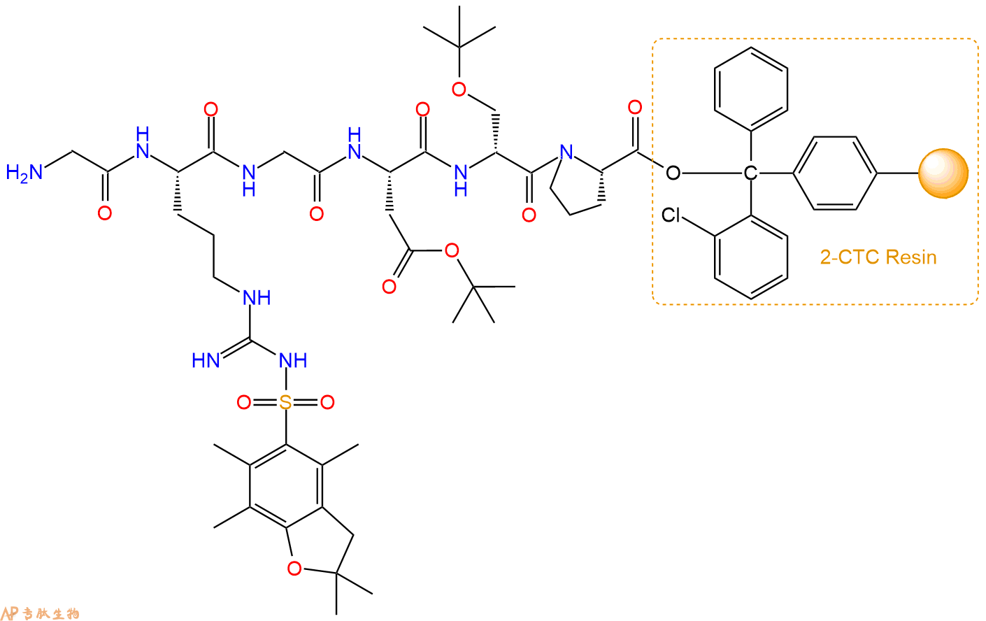 最后再经过步骤二得到 H2N-Gly-Arg(Pbf)-Gly-Asp(OtBu)-DSer(tBu)-Pro-CTC Resin,结构如下: