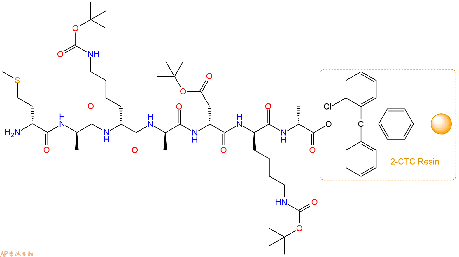 最后再经过步骤二得到 H2N-DMet-DAla-DLys(Boc)-DAla-DAsp(OtBu)-DLys(Boc)-DAla-CTC Resin,结构如下: