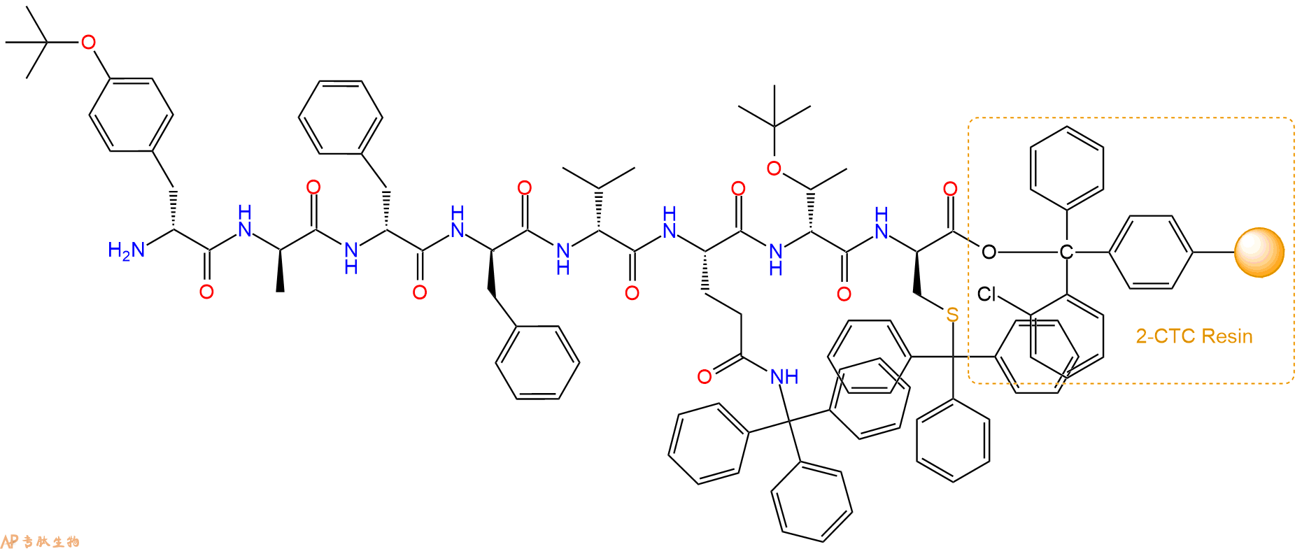 最后再经过步骤二得到 H2N-DTyr(tBu)-DAla-DPhe-DPhe-DVal-DGln(Trt)-DThr(tBu)-DCys(Trt)-CTC Resin,结构如下: