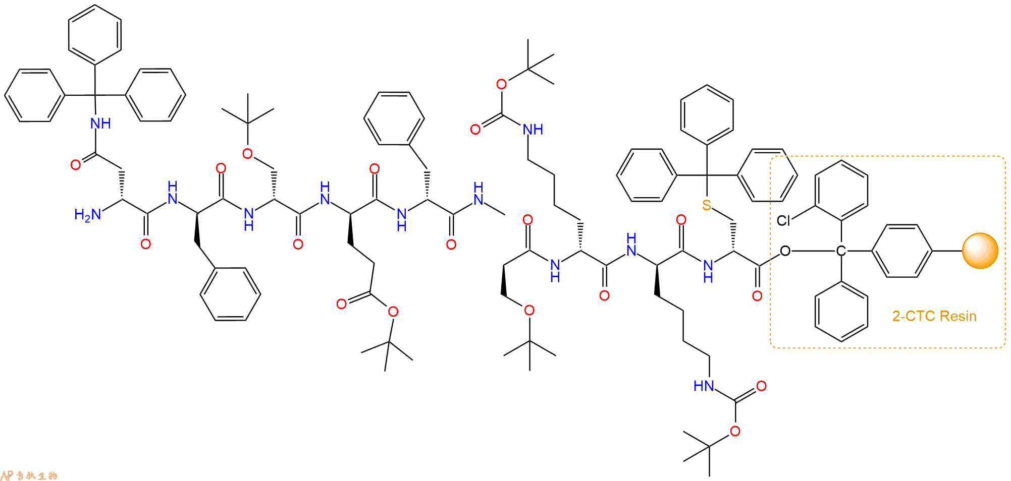 最后再经过步骤二得到 H2N-DAsn(Trt)-DPhe-DSer(tBu)-DGlu(OtBu)-DPhe-DSer(tBu)-DLys(Boc)-DLys(Boc)-DCys(Trt)-CTC Resin,结构如下:
