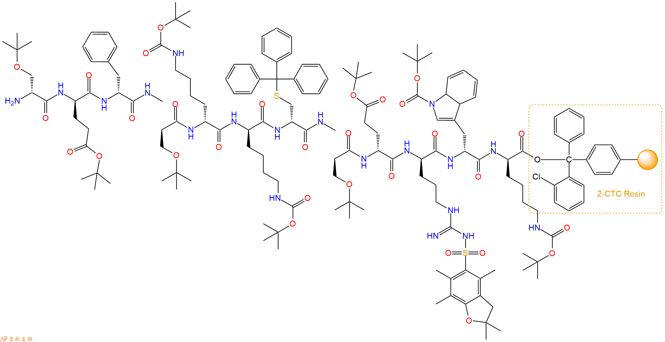 最后再经过步骤二得到 H2N-DSer(tBu)-DGlu(OtBu)-DPhe-DSer(tBu)-DLys(Boc)-DLys(Boc)-DCys(Trt)-DSer(tBu)-DGlu(OtBu)-DArg(Pbf)-DTrp(Boc)-DLys(Boc)-CTC Resin,结构如下:
