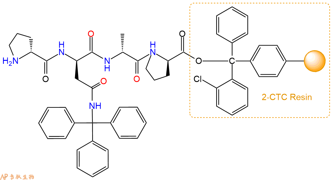 最后再经过步骤二得到 H2N-DPro-DAsn(Trt)-DAla-DPro-CTC Resin,结构如下: