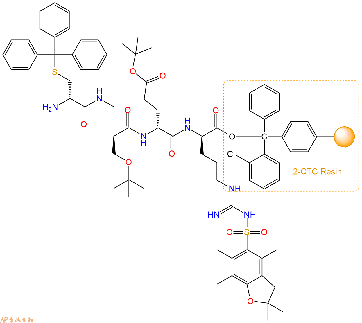 最后再经过步骤二得到 H2N-DCys(Trt)-DSer(tBu)-DGlu(OtBu)-DArg(Pbf)-CTC Resin,结构如下: