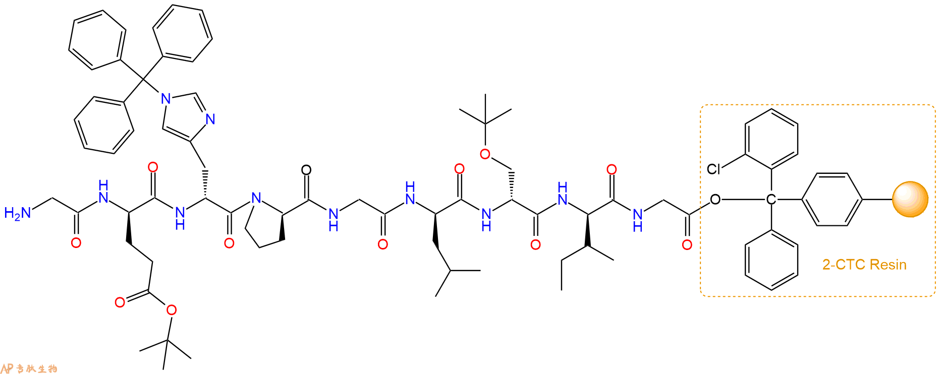 最后再经过步骤二得到 H2N-Gly-DGlu(OtBu)-DHis(Trt)-DPro-Gly-DLeu-DSer(tBu)-DIle-Gly-CTC Resin,结构如下: