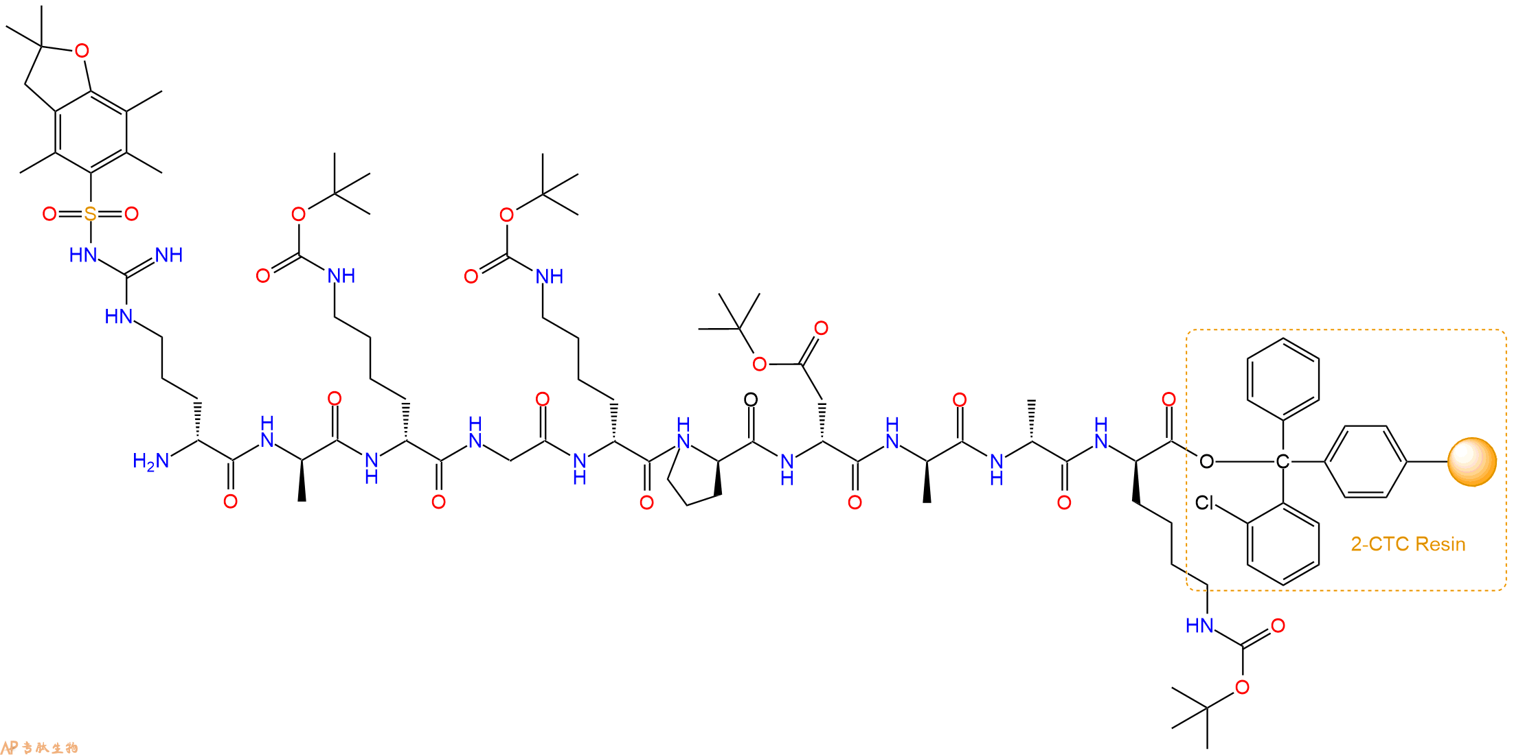 最后再经过步骤二得到 H2N-DArg(Pbf)-DAla-DLys(Boc)-Gly-DLys(Boc)-DPro-DAsp(OtBu)-DAla-DAla-DLys(Boc)-CTC Resin,结构如下:
