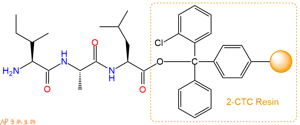 最后再经过步骤二得到 H2N-Ile-Ala-Leu-CTC Resin,结构如下: