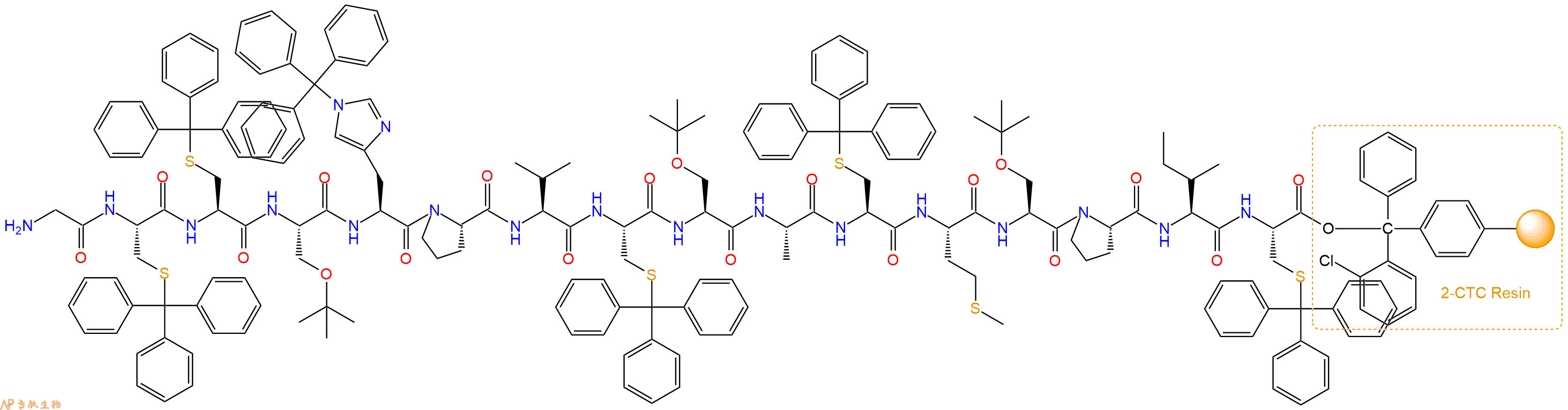 最后再经过步骤二得到 H2N-Gly-Cys(Trt)-Cys(Trt)-Ser(tBu)-His(Trt)-Pro-Val-Cys(Trt)-Ser(tBu)-Ala-Cys(Trt)-Met-Ser(tBu)-Pro-Ile-Cys(Trt)-CTC Resin,结构如下: