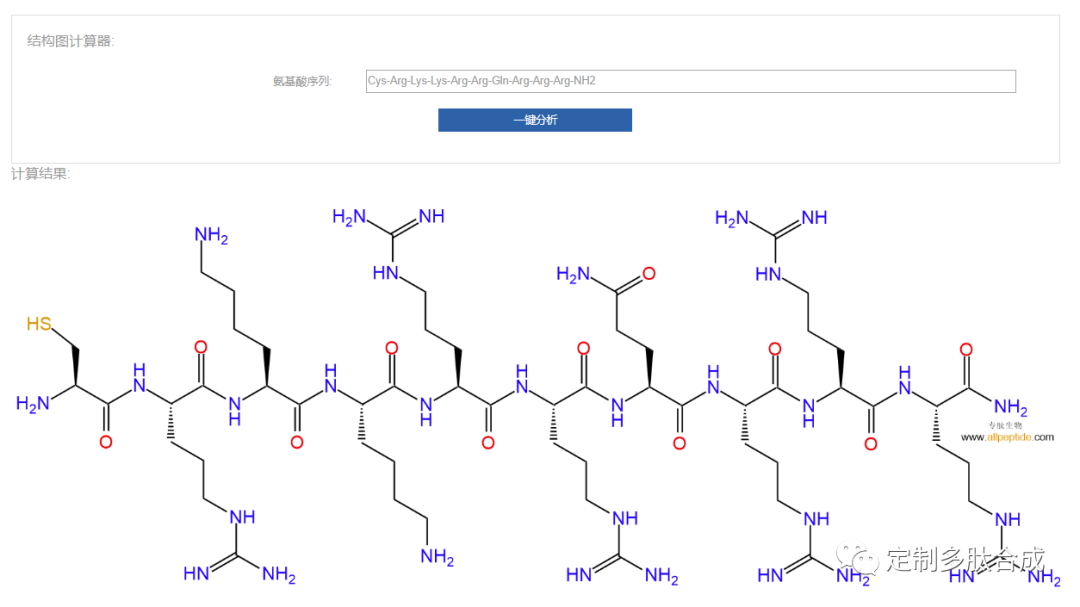 1、例如 输入细胞穿膜肽 Cys-TAT(49-57)的单字母序列,CRKKRRQRRR-NH2,或者三字母序列Cys-Arg-Lys-Lys-Arg-Arg-Gln-Arg-Arg-Arg-NH2,