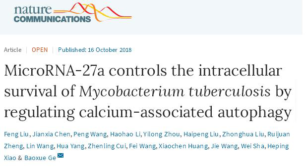 10月16日,同济大学医学院、同济大学附属上海市肺科医院戈宝学教授团队在Nature Communications杂志在线报道了结核分枝杆菌通过上调miR-27a的表达来抑制宿主巨噬细胞的内质网表面的钙离子通道蛋白CACNA2D3,从而降低钙信号依赖的细胞自噬以促进结核分枝杆菌的胞内存活及感染发病的研究进展。