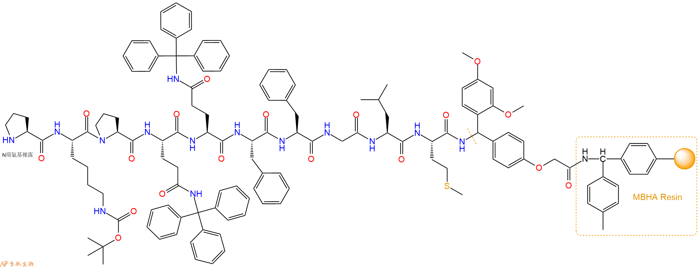 最后再经过步骤二得到 H2N-Pro-Lys(Boc)-Pro-Gln(Trt)-Gln(Trt)-Phe-Phe-Gly-Leu-Met-Linker-MBHA Resin,结构如下: