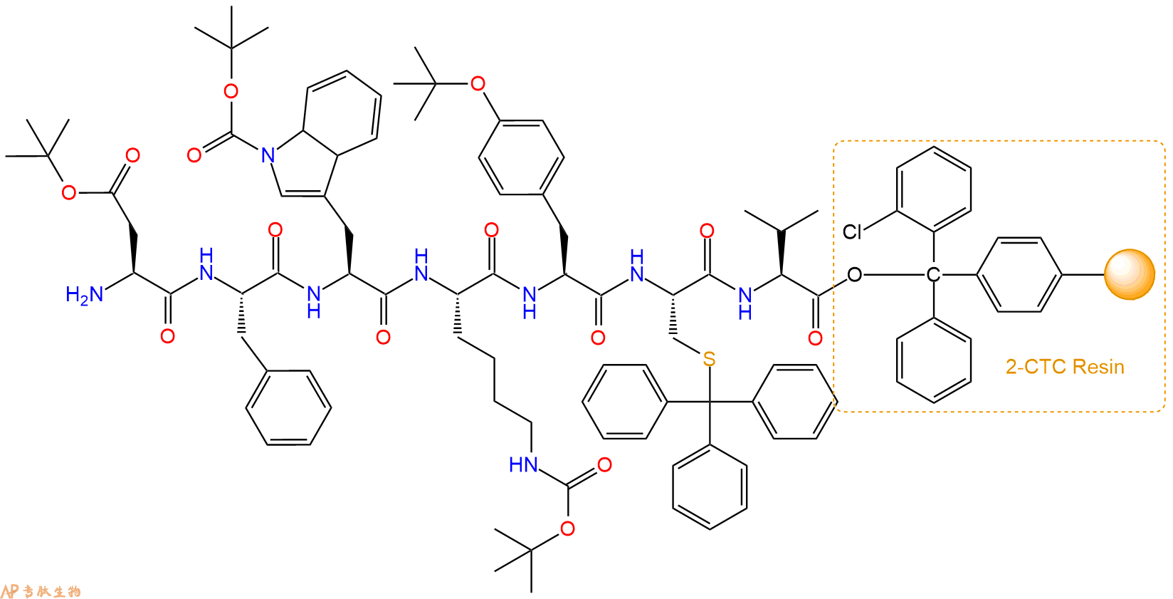 最后再经过步骤二得到 H2N-Asp(OtBu)-Phe-Trp(Boc)-Lys(Boc)-Tyr(tBu)-Cys(Trt)-Val-CTC Resin,结构如下: