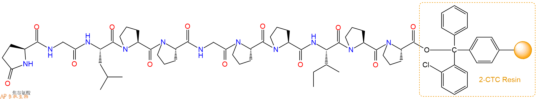 5、焦谷氨酸反应连接:在上述树脂中,加入适当DMF后,再加入2.33mmol 焦谷氨酸到树脂中,再加入4.66mmol DIPEA、2.21mmol HBTU,鼓氮气反应30分钟。用2倍树脂体积的DMF 洗涤3次树脂(洗涤树脂,去掉残留溶剂,为下一步反应做准备)。 得到Pyr-Gly-Leu-Pro-Pro-Gly-Pro-Pro-Ile-Pro-Pro-CTCResin。 结构如下: