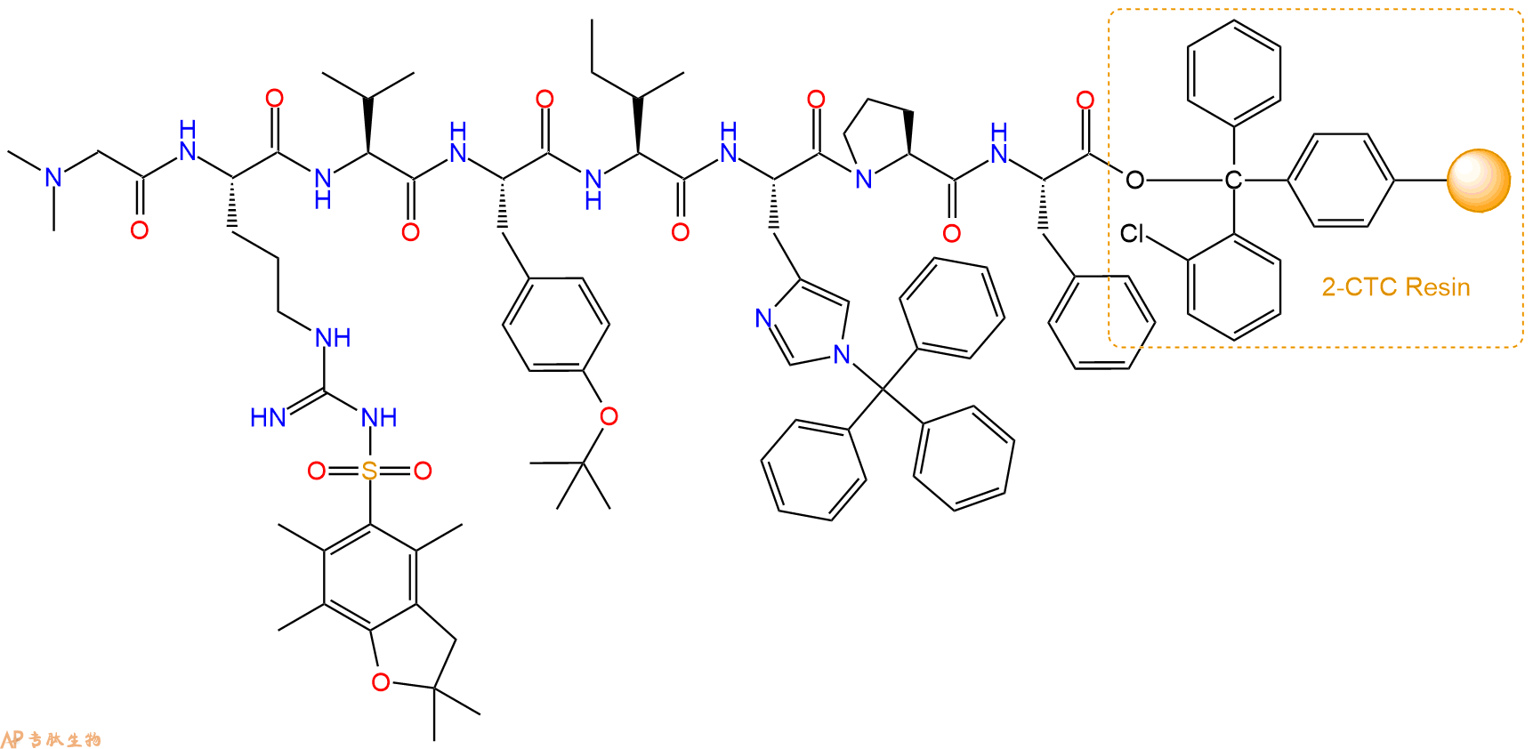 最后再经过步骤二得到 H2N-Sar-Arg(Pbf)-Val-Tyr(tBu)-Ile-His(Trt)-Pro-Phe-CTC Resin,结构如下: