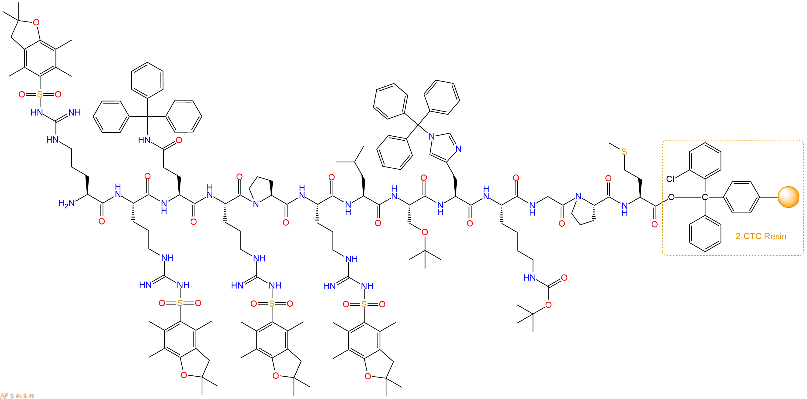 最后再经过步骤二得到 H2N-Arg(Pbf)-Arg(Pbf)-Gln(Trt)-Arg(Pbf)-Pro-Arg(Pbf)-Leu-Ser(tBu)-His(Trt)-Lys(Boc)-Gly-Pro-Met-CTC Resin,结构如下: