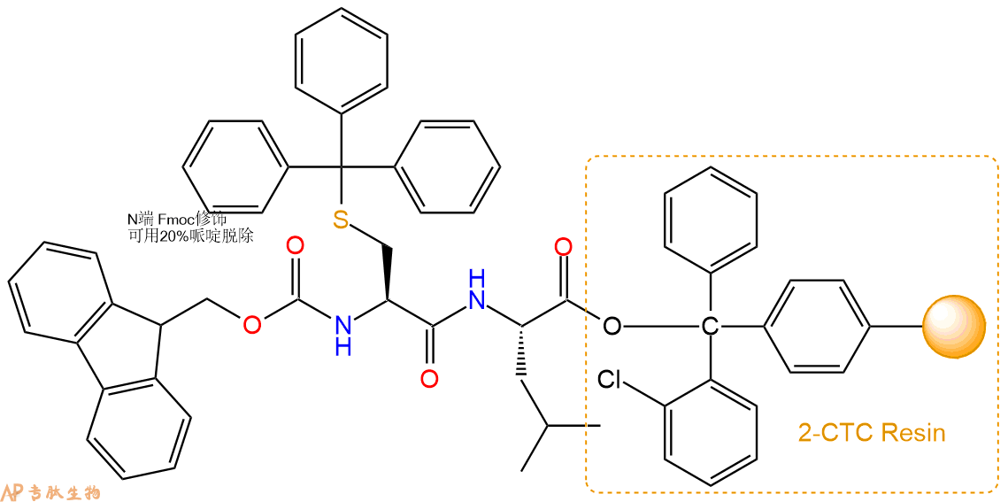 1、合成CTC树脂:称取2.85g CTC Resin(如初始取代度约为1.15mmol/g)和3.93mmol Fmoc-Leu-OH于反应器中,加入适量DCM溶解氨基酸(需要注意,此时CTC树脂体积会增大好几倍,避免DCM溶液过少),再加入9.83mmol DIPEA(Mw:129.1,d:0.740g/ml),反应2-3小时后,可不抽滤溶液,直接加入1ml的HPLC级甲醇,封端半小时。依次用DMF洗涤2次,甲醇洗涤1次,DCM洗涤一次,甲醇洗涤一次,DCM洗涤一次,DMF洗涤2次(这里使用甲醇和DCM交替洗涤,是为了更好地去除其他溶质,有利于后续反应)。得到 Fmoc-Leu-CTC Resin。结构图如下: