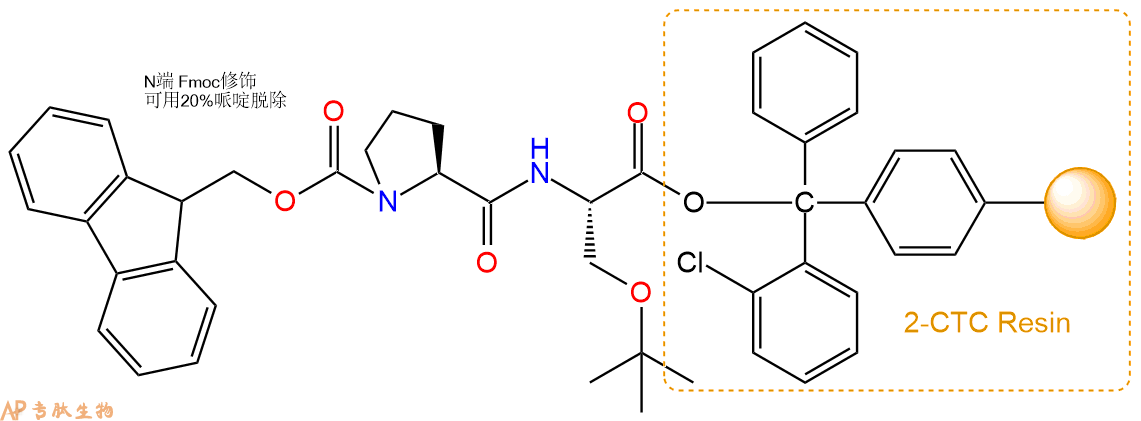 1、合成CTC树脂:称取0.9g CTC Resin(如初始取代度约为1.16mmol/g)和1.25mmol Fmoc-Ser(tBu)-OH于反应器中,加入适量DCM溶解氨基酸(需要注意,此时CTC树脂体积会增大好几倍,避免DCM溶液过少),再加入3.13mmol DIPEA(Mw:129.1,d:0.740g/ml),反应2-3小时后,可不抽滤溶液,直接加入1ml的HPLC级甲醇,封端半小时。依次用DMF洗涤2次,甲醇洗涤1次,DCM洗涤一次,甲醇洗涤一次,DCM洗涤一次,DMF洗涤2次(这里使用甲醇和DCM交替洗涤,是为了更好地去除其他溶质,有利于后续反应)。得到 Fmoc-Ser(tBu)-CTC Resin。结构图如下: