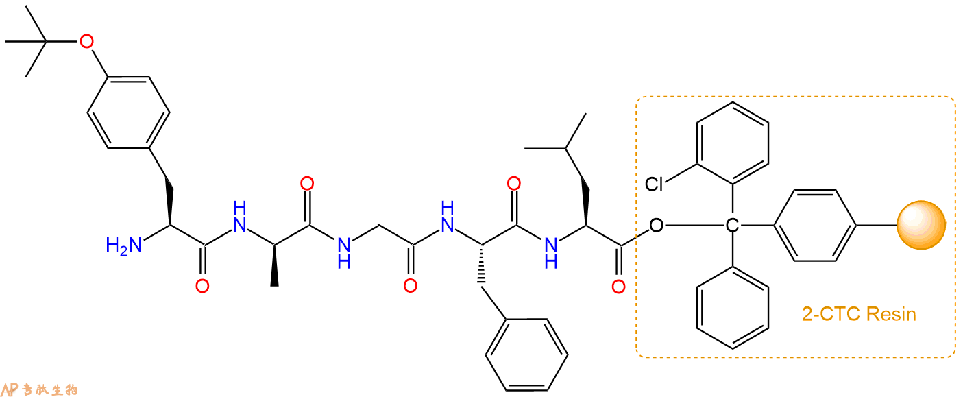 最后再经过步骤二得到 H2N-Tyr(tBu)-DAla-Gly-Phe-Leu-CTC Resin,结构如下: