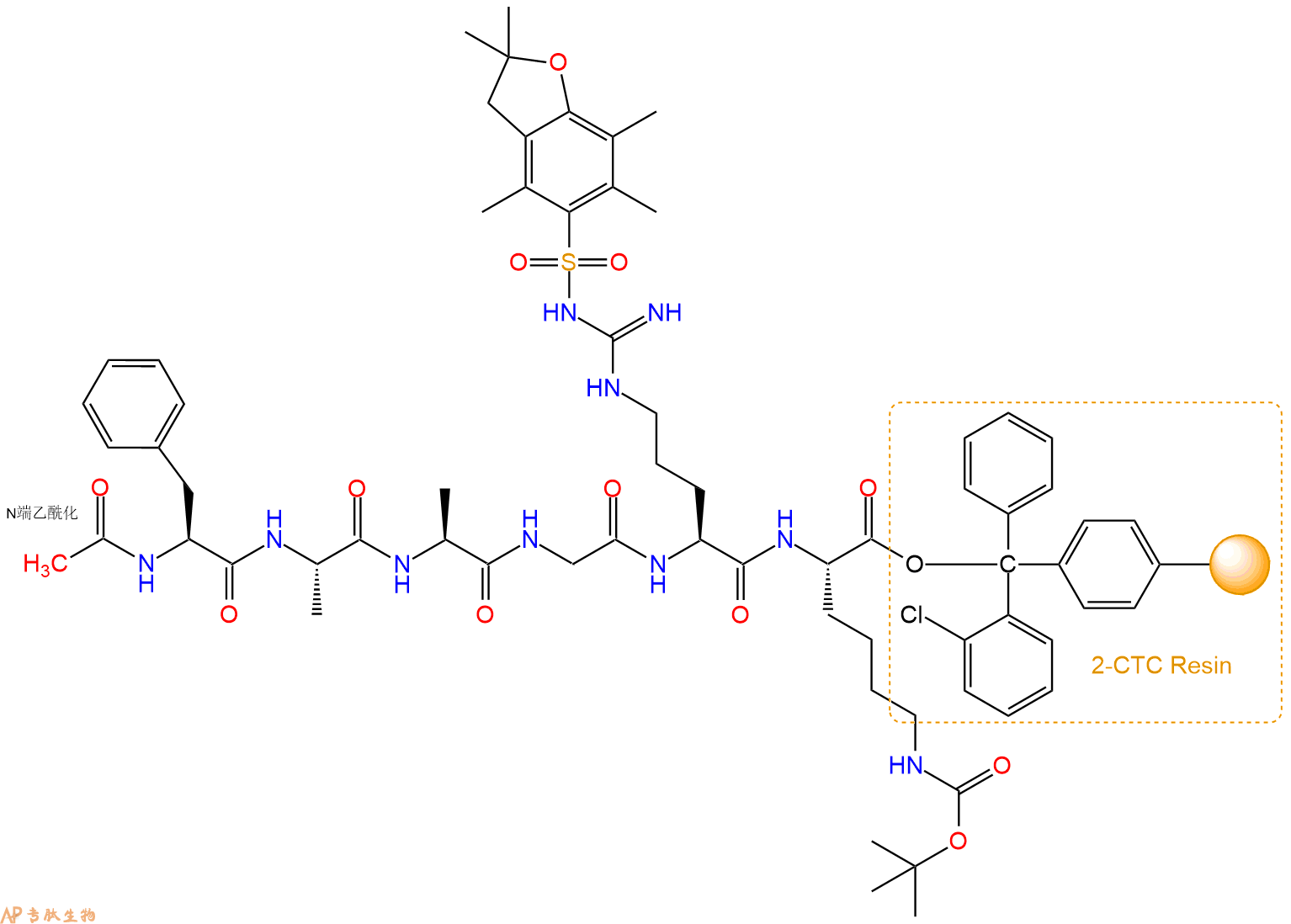 5、乙酸酐反应连接:在上述树脂中,加入适当DMF后,再加入1.11mmol 乙酸酐到树脂中,再加入2.22mmol DIPEA、1.05mmol HBTU,鼓氮气反应30分钟。用2倍树脂体积的DMF 洗涤3次树脂(洗涤树脂,去掉残留溶剂,为下一步反应做准备)。 得到Ac-Phe-Ala-Ala-Gly-Arg(Pbf)-Lys(Boc)-CTC Resin。 结构如下: